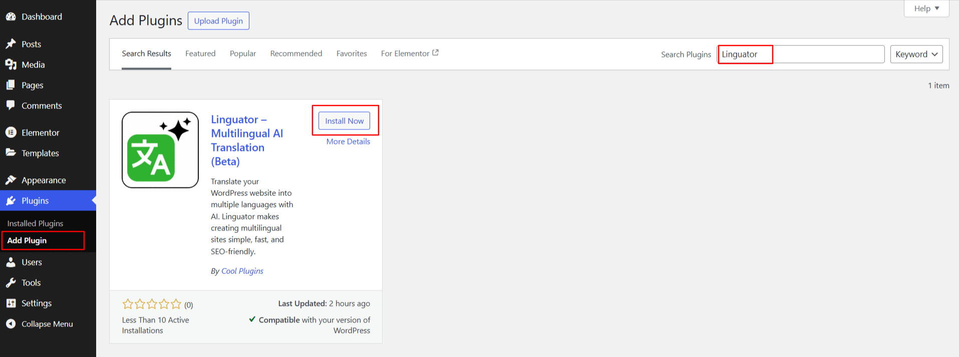 • Search for the “Linguator” plugin.